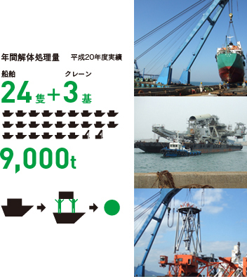 船舶・荷役設備・ジブクレーン等の解体処理を行い、その構造・設備の9割以上を、高品質な再資源の製綱原料として安定的に鉄鋼業界に供給しています。