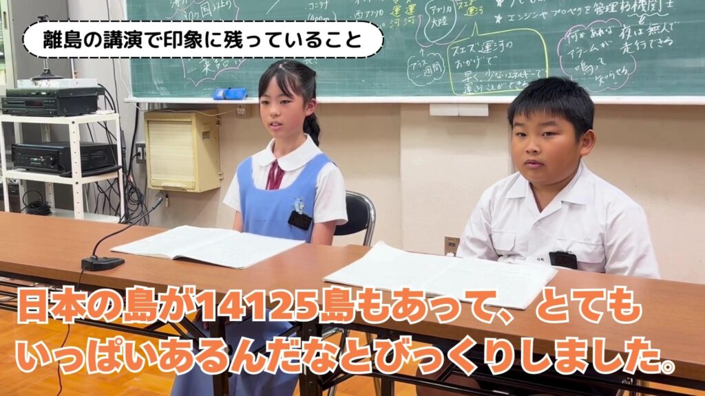 領海、排他的経済水域や日本の歴史を学ぶことにより、島の大切さ、島を守ることは日本の平和につながることを知りました。