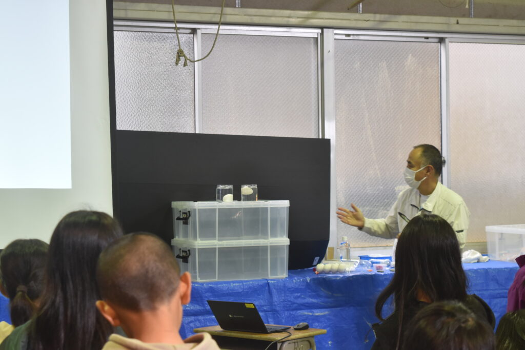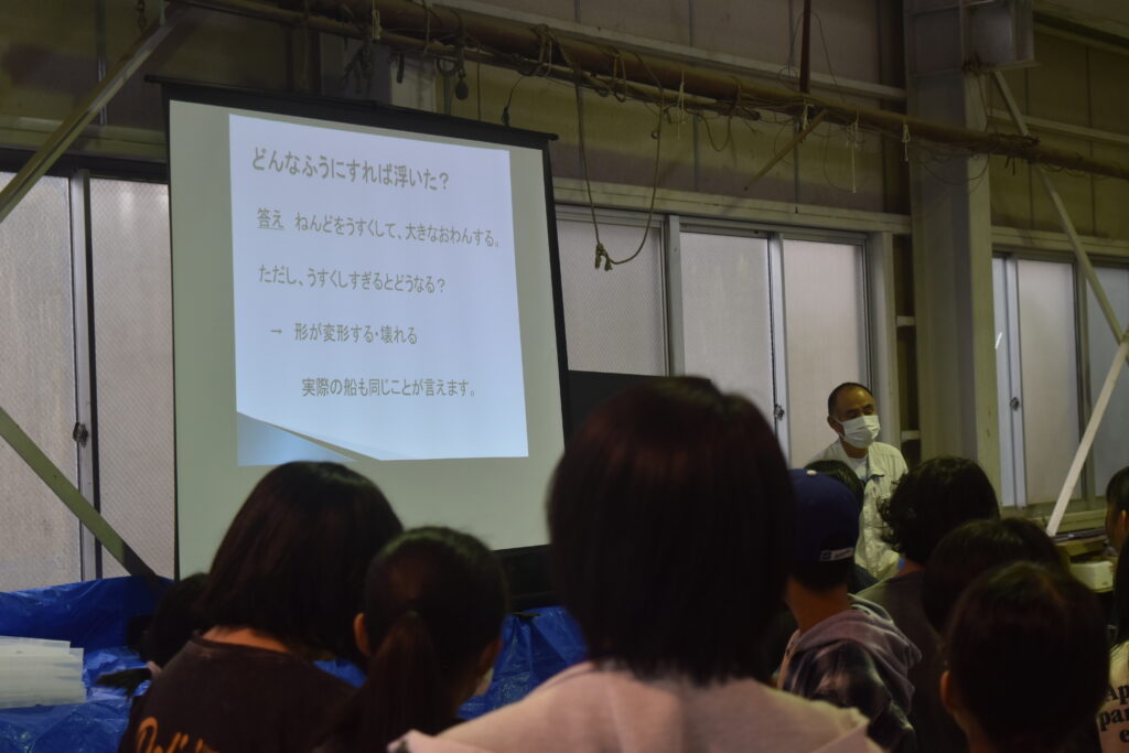 造船専攻の授業をされている先生に浮力についての授業をしていただきます。